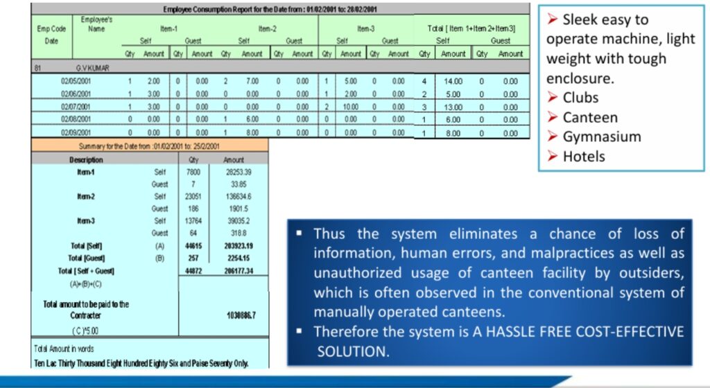 All standard reports regarding the meal cost of an individual and the total canteen consumption units with the cost is provided. The amounts to be paid to the contractor as well as the cost of subsidy are recorded. Smart Canteen Management with LED Pvt. Ltd.